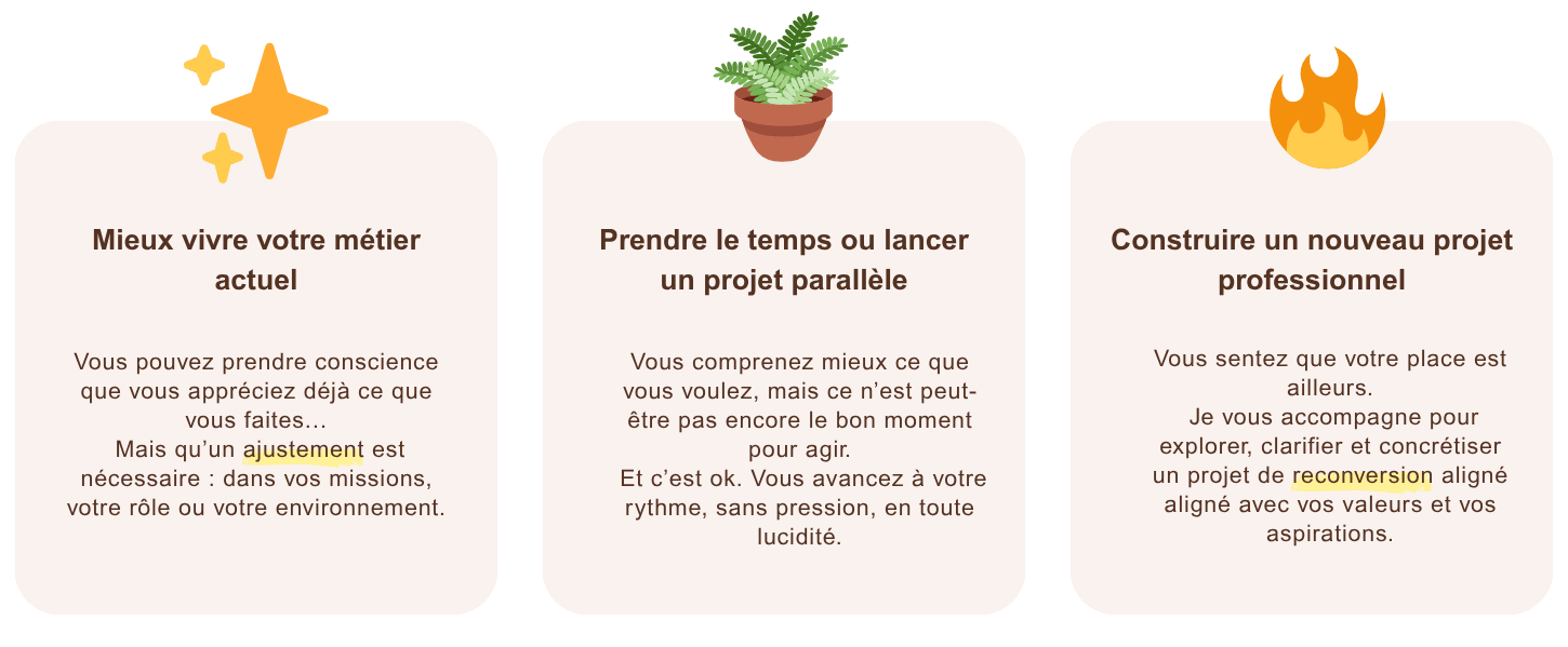Sauf que ce décalage entre ce que vous faites et ce que vous êtes ne se règle pas avec de la patience. Il se règle en clarifiant ce qui vous anime et en construisant un projet professionnel à la hauteur.